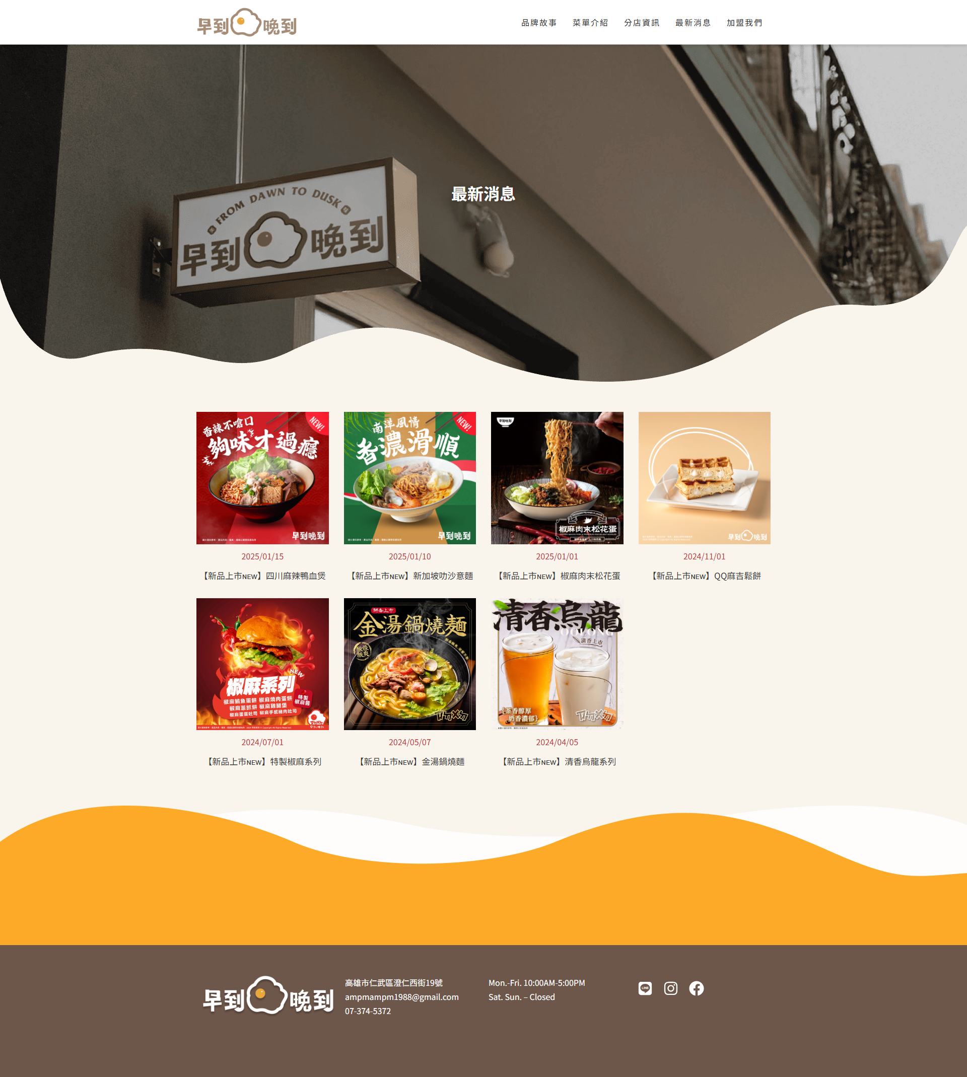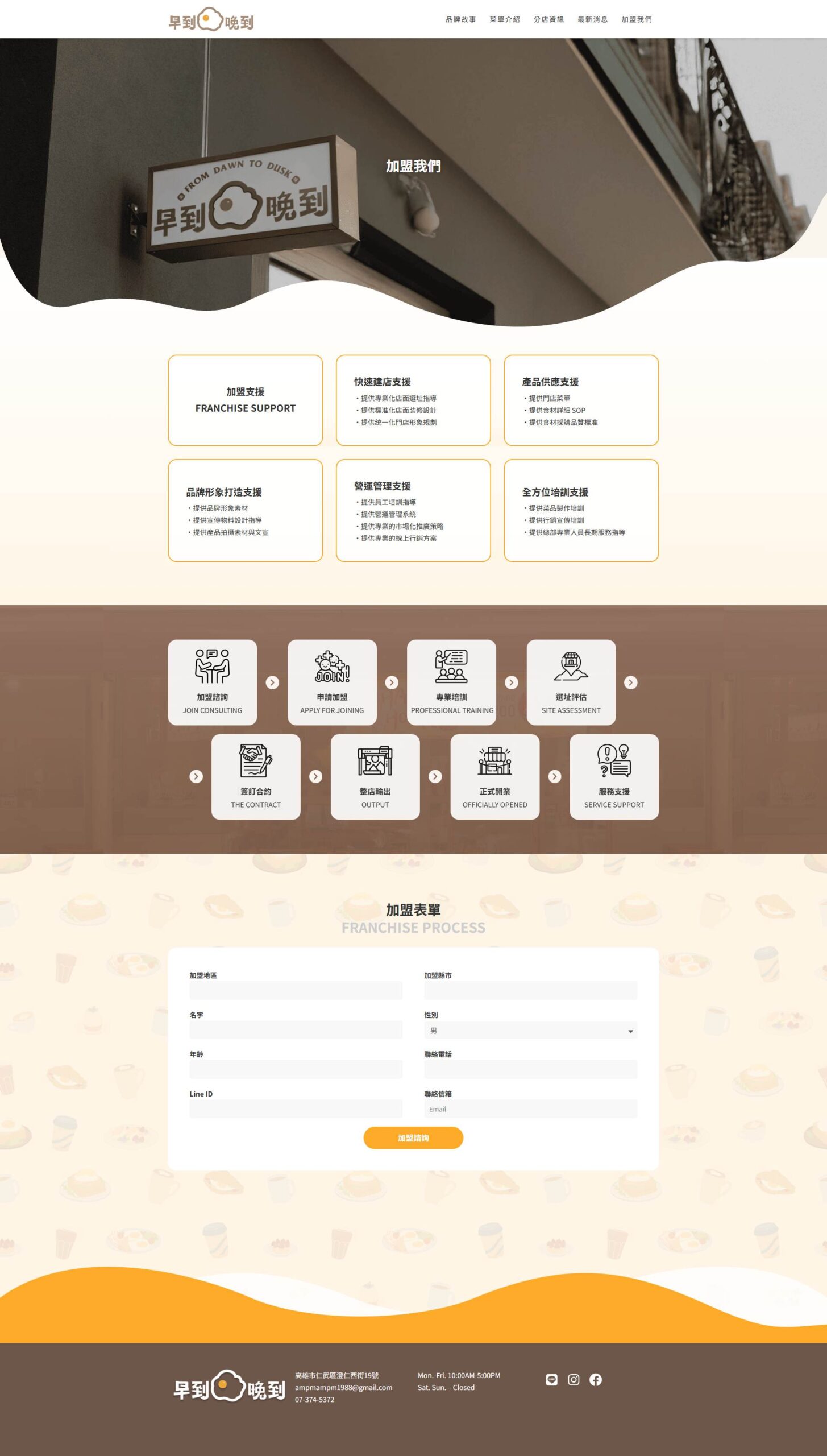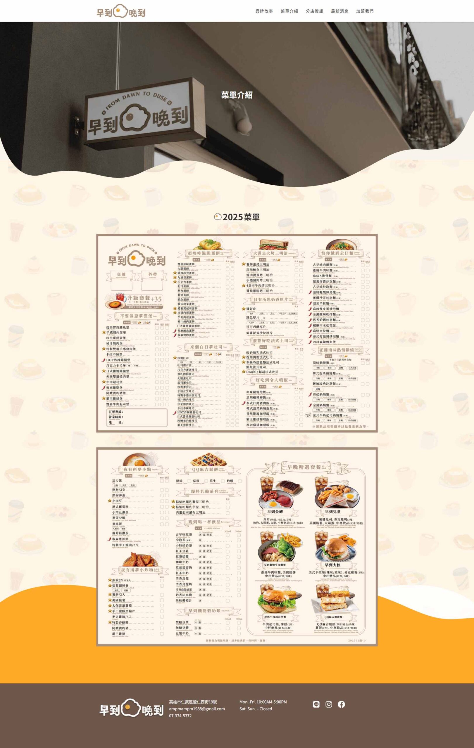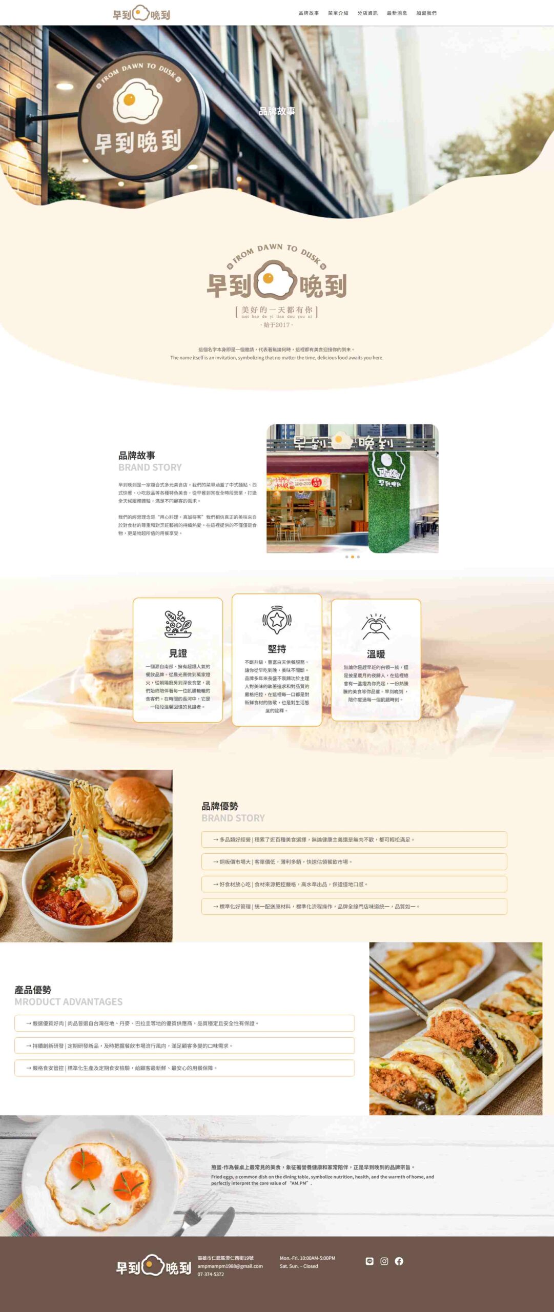 本專案為台灣知名宵夜連鎖品牌「早到晚到」開發的官方形象網站。網站核心任務在於雙向的價值傳遞:對外,建構強烈的品牌視覺與產品吸引力以服務終端消費者;對內,透過標準化的加盟資訊揭露與招募流程,支援企業的連鎖擴張策略。